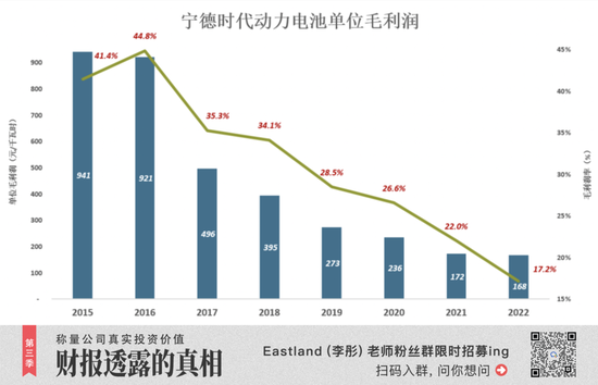 2015年毛利润率超过40%,宁德时代扣非净利润9.5亿;2022年毛利润率不到18%,扣非净利润282亿,约为2015年的30倍!