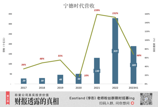 近些年来,宁德时代营收增速一直高于全球和中国新能源车增速。2023年H1,尽管在国内动力电池市场的份额下降,营收还是跑赢大盘20多个百分点。