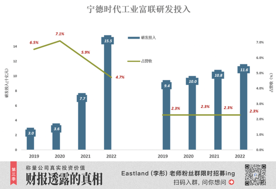 至于研发投入占营收的比值,宁德时代一直比工业富联高一两倍。2020年达7.1%,2022年为4.7%。工业富联研发投入基本维持在营收的2.3%。