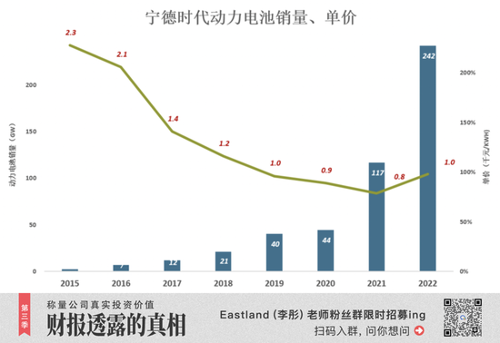 2018年6月,宁德时代在创业板上市。到2021年,IPO募集资金效果开始显现,销量同比增长162.6%至117GWh,与此同时单价也降至历史低点,不到800元/千瓦时。