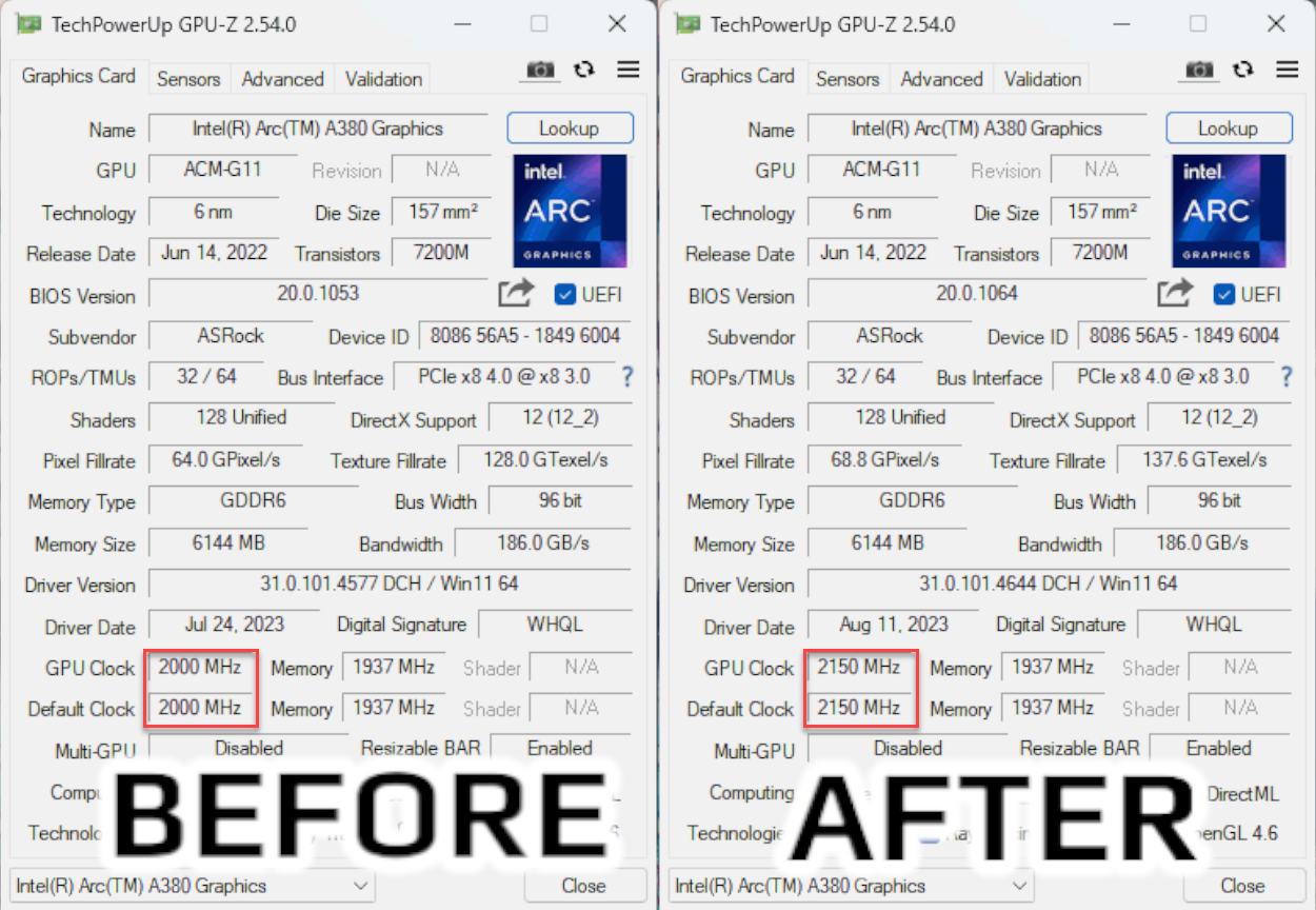 然而,Eternal Tempest 在查看 GPU-Z 时发现他的华擎?Arc A380 显卡频率从 2000 MHz 上升到 2150 MHz,提升幅度达到了 7.5%,因此这款现款的的像素和纹理填充率也得到了改进,从 64 GPixel / s 和 128 GTexel / s 提升到 68.8 GPixel / s 和 137.6 GTexel / s。