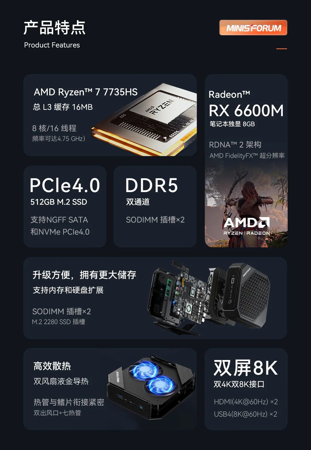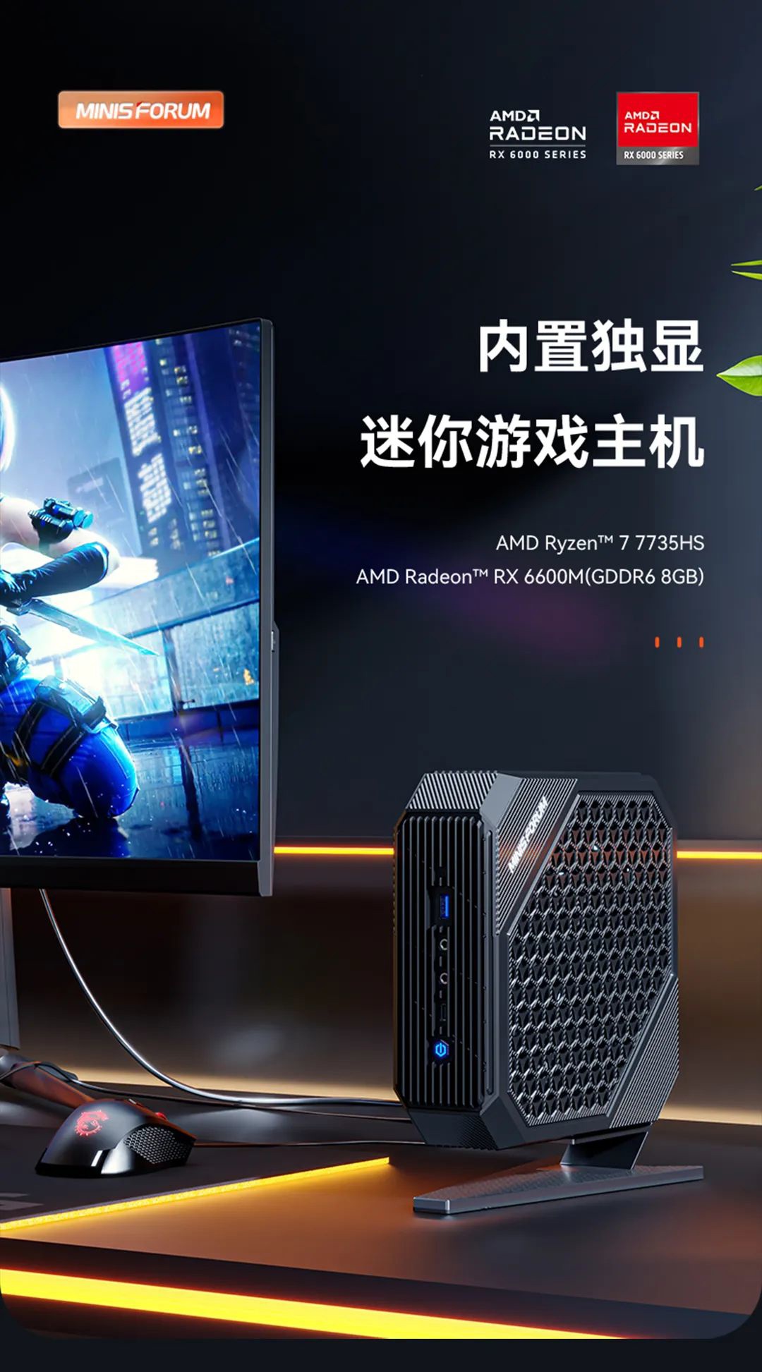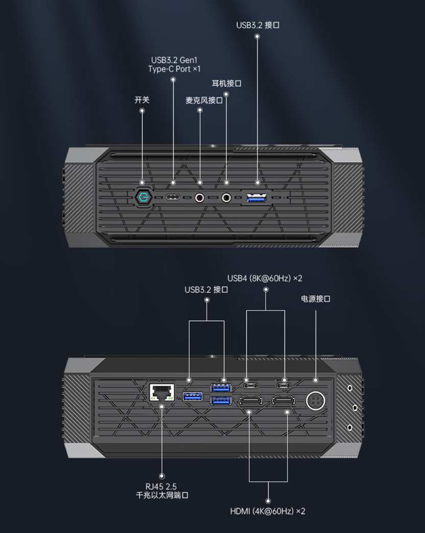 铭凡 HX77G 搭载了 AMD?锐龙 7 7735HS 移动处理器 +?RX 6600M 移动独显,定位?1080P 高刷游戏。该机支持 DDR5 双通道内存,配合 PCIe 4.0 固态硬盘,并拥有 2 个 USB4 高速接口。
