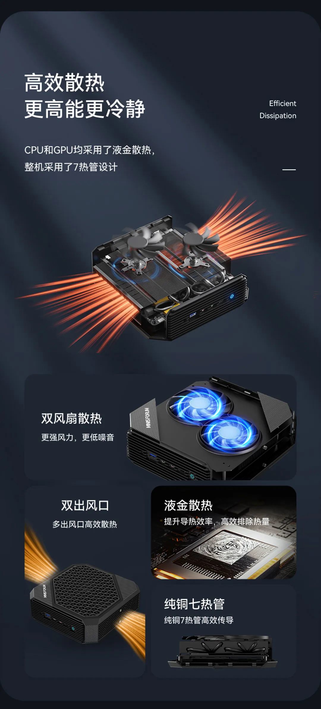 此外,铭凡 HX77G 的 CPU 和 GPU 均使用了液金散热,配有双风扇 + 7 热管,还有双出风口。
