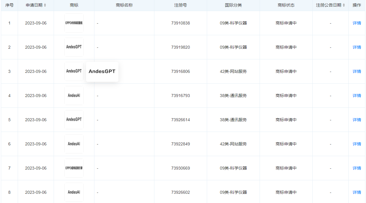 IT之家 9 月 11 日消息,OPPO 广东移动通信有限公司上周申请注册了多个“AndesGPT”“AndesAI”商标,国际分类为科学仪器、通讯服务、网站服务,当前商标状态均为申请中。