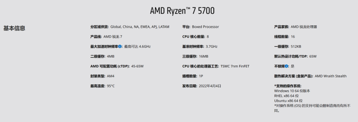 从参数上来看,锐龙7 5700采用Zen 3架构核心,8核心16线程设计,基础频率为3.7GHz,加速频率为4.6GHz,TDP为65W,没有配备核显,拥有4MB L2缓存和16MB L3缓存,和锐龙7 5700X相比L3缓存容量少了一半,与锐龙7 5700G相同。