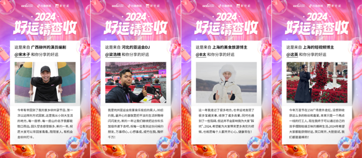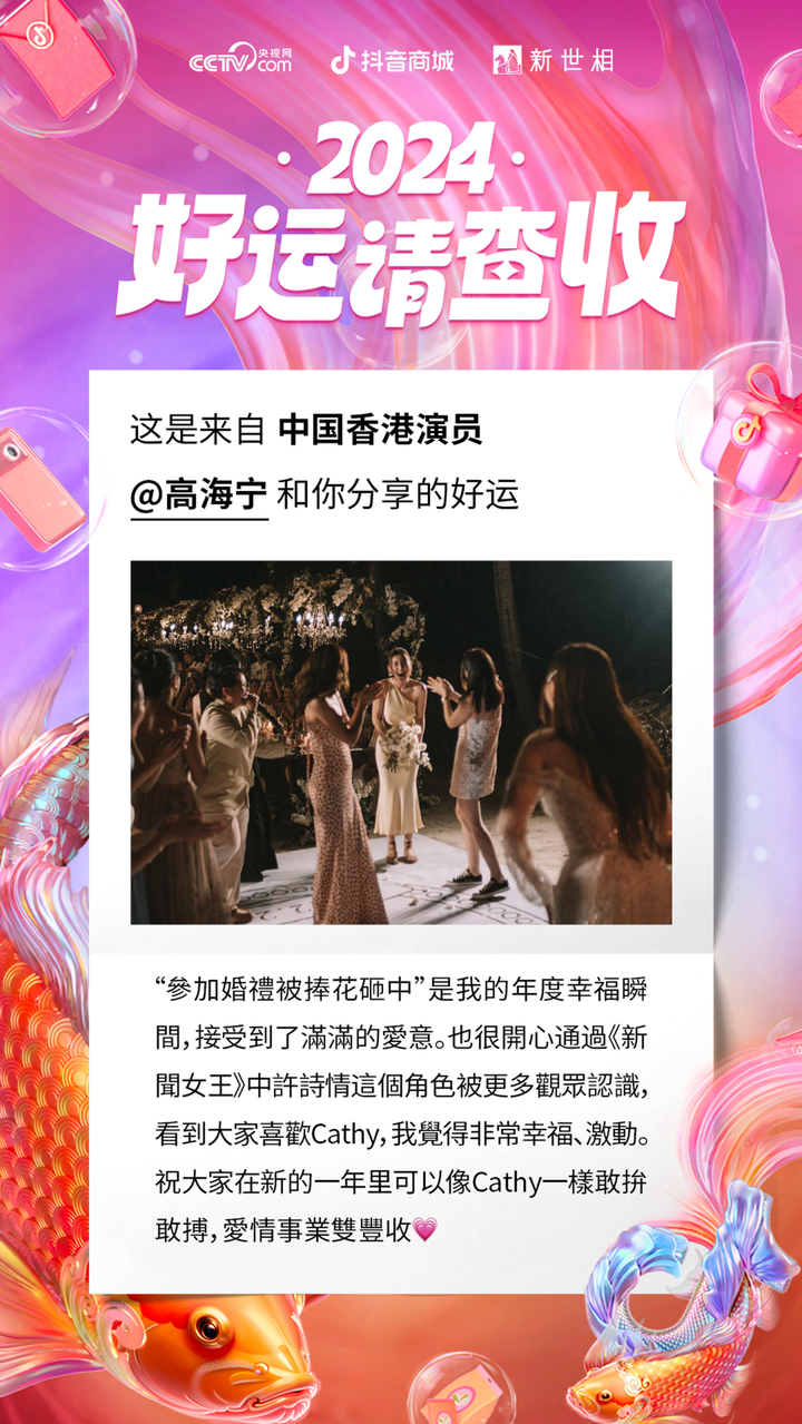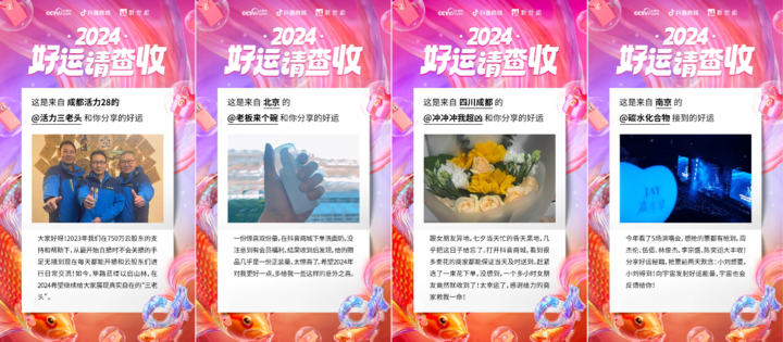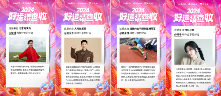 这些故事来自央视网、抖音商城、新世相共同推出的「2024 好运请查收」全民接好运特别策划活动。12 月 20 日至 12 月 31 日,参与活动抽奖,就有机会 1 分钱抽取抖音商城双旦锦鲤大礼包,也有机会 1 分钱低价抢 88 家近 8 万件大牌好礼,还可能获得抖音商城千万元购物红包及优惠券。