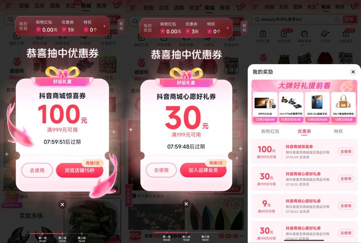 除此之外,抖音商城「2024 好运请查收」主打的就是人人都能赢好运,活动还提供超百万份金额不等的购物红包和优惠券,抖音商城惊喜券、心愿好礼券,下单时可直接抵扣,心仪的商品便宜买,也算是一种好运气。