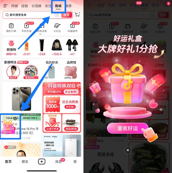 打开抖音 App,点击最上方的「商城」按钮,开屏即可参与活动,查收好运。