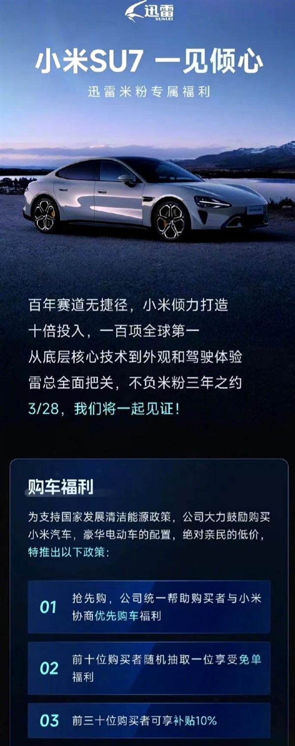 而在3月26日,该海报信息被迅雷公司撤回,但迅雷方面表示并非取消了购车福利,而是等3月28日小米SU7上市后调整福利政策。