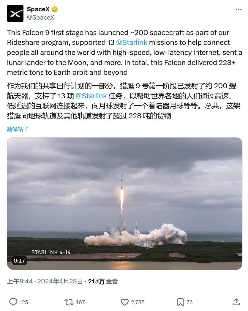 IT之家 4 月 28 日消息,SpaceX 公司于北京时间今天上午 8 点 34 分,在美国宇航局佛罗里达州肯尼迪航天中心(KSC)的 39A 发射场(LC-39A)发射猎鹰 9 号火箭,而本次最大的区别在于不回收 B1060 一级助推器。