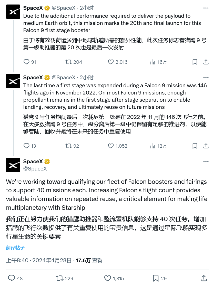 SpaceX 表示由于本次任务要将有效载荷运送到中等地球轨道,需要更强悍的动力输出,因此本次发射不再回收编号 B1060 的一级助推器。