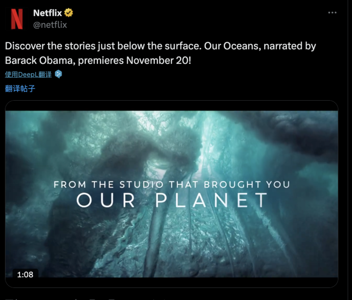 Netflix 鍦?X 骞冲彴鏀惧嚭浜嗚嚜鐒剁邯褰曞墽闆嗐€婃垜浠殑娴锋磱銆嬮鍛婄墖锛屽悓鏃跺甯冭鍓ч泦灏嗕簬 11 鏈?20 鏃ユ挱鍑恒€?/p>